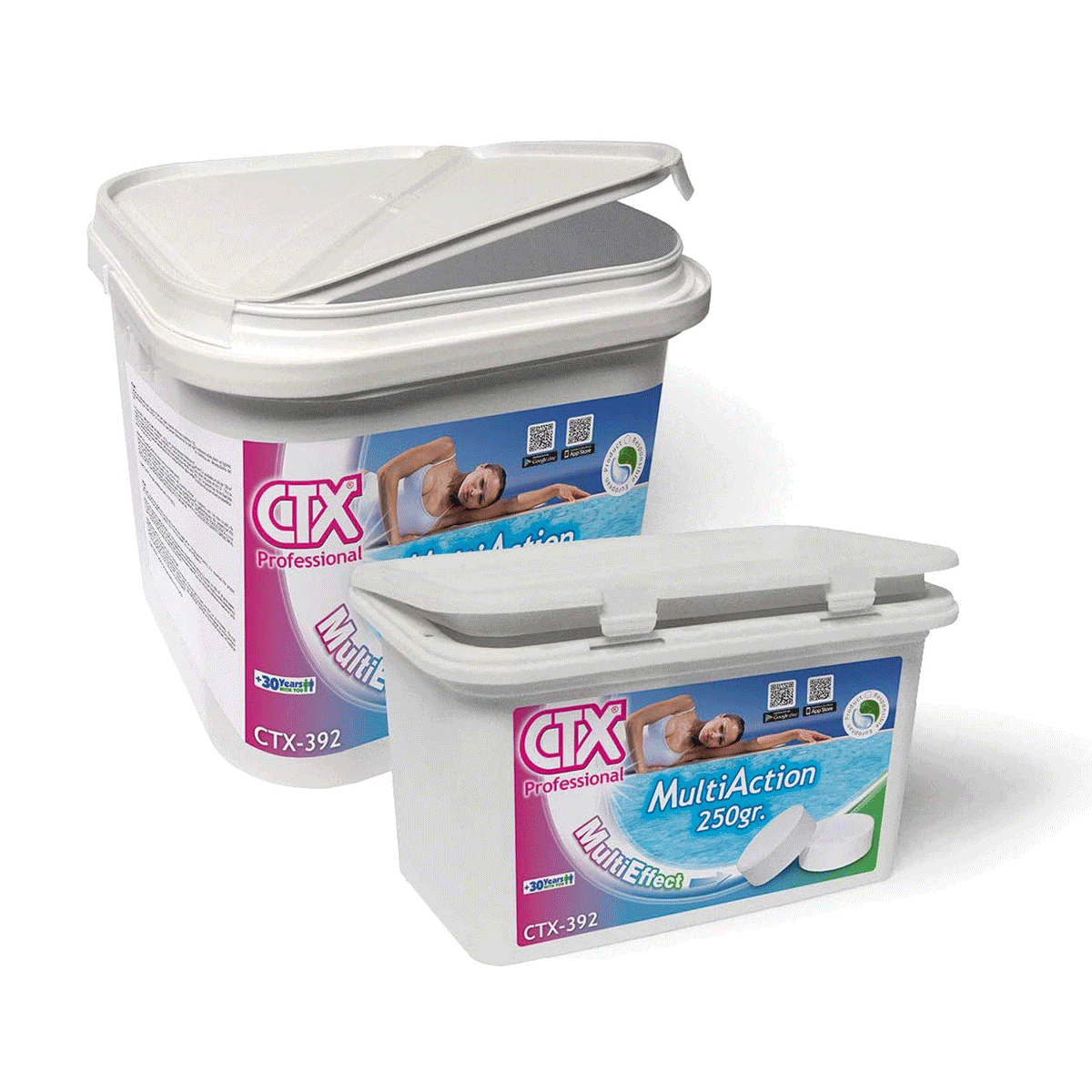 CTX 392 è utilizzato nel trattamento dellacqua di piscina per igienizzare, chiarificare lacqua ed eliminare le alghe. CTX 392 è un prodotto multiazione in pastiglie da 250 g, ad azione igienizzante e, allo stesso tempo, alghicida e flocculante.